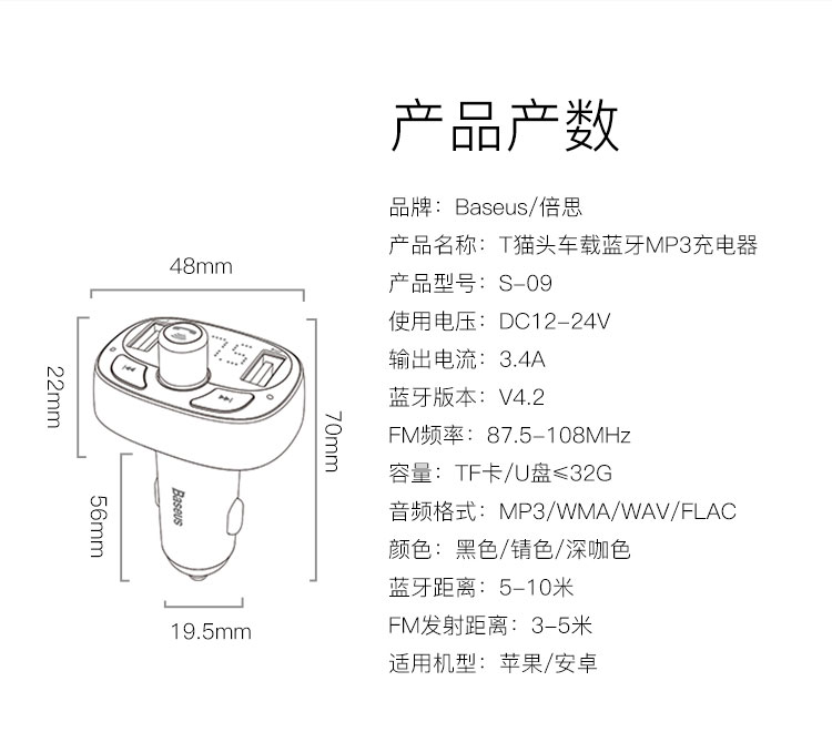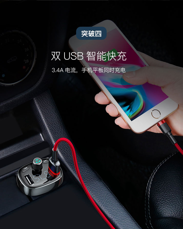 京东自营倍思(Baseus)车载mp3播放器汽车充蓝牙免提电话 FM发射器接收器车载充电器双USB一拖三数据线套装 黑色
