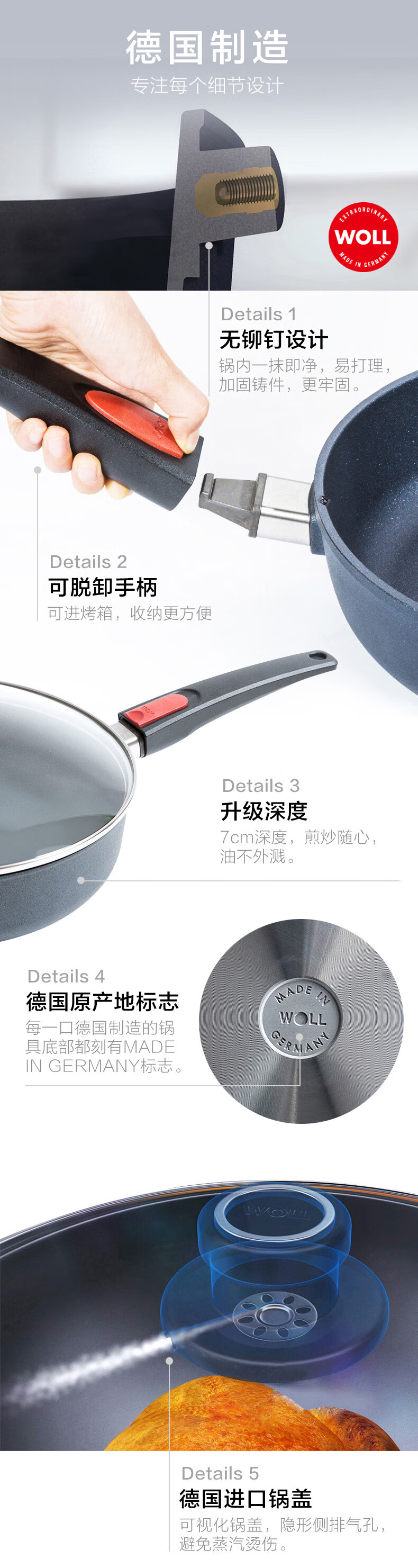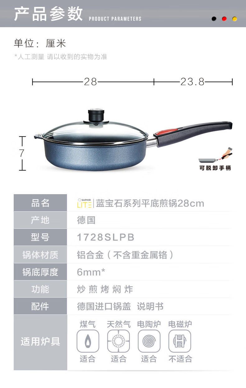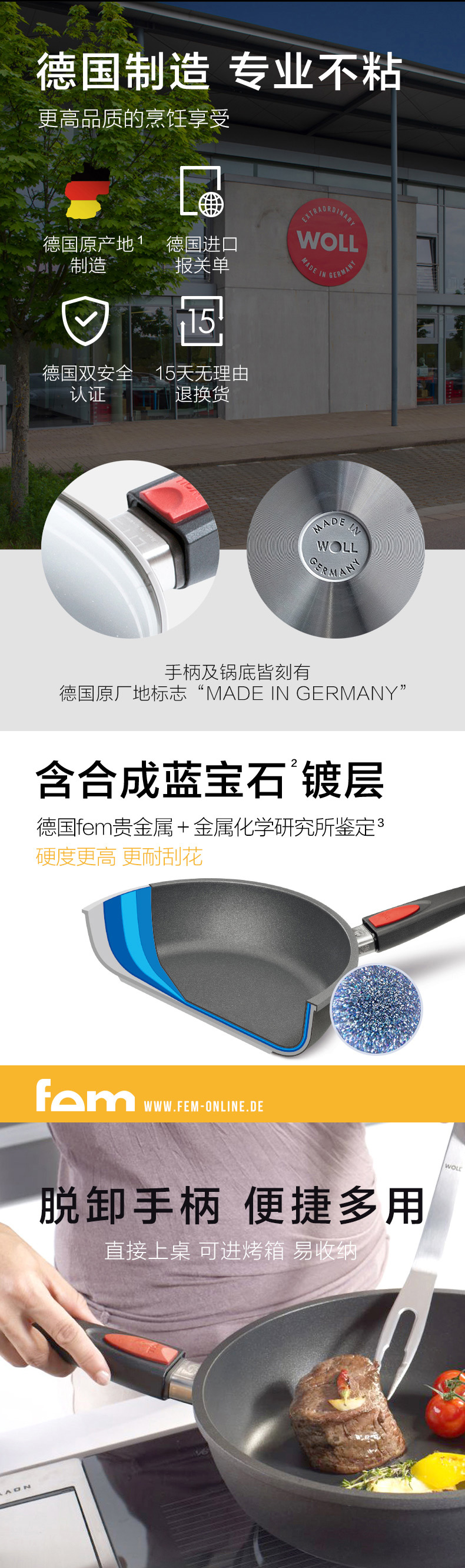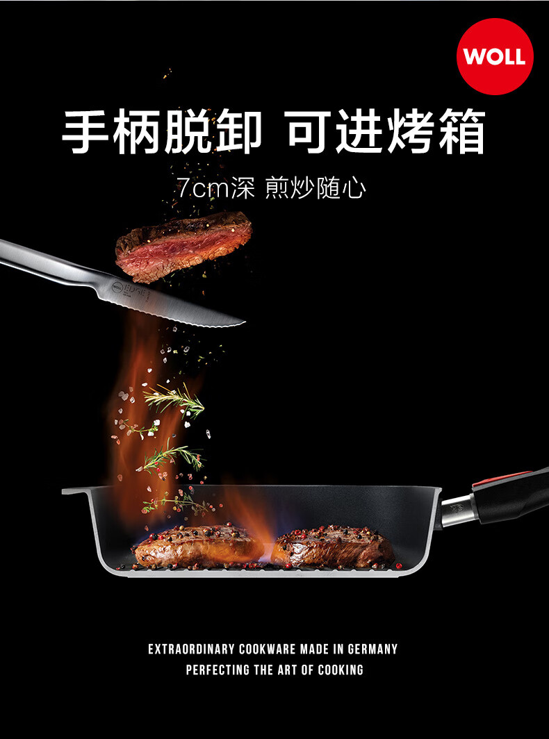 京东自营WOLL 德国制造不粘锅 蓝宝石系列平底锅28cm 牛排煎锅 家用炒菜锅 可脱卸手柄 进口锅具