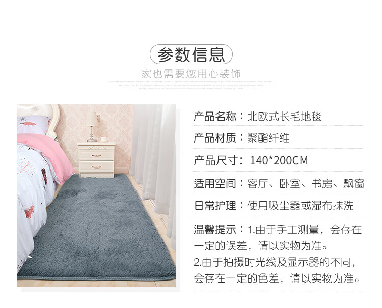 京东自营意尔嫚 地毯 ins北欧地毯客厅卧室满铺地毯长绒沙发地毯床边毯 灰色 140*200cm