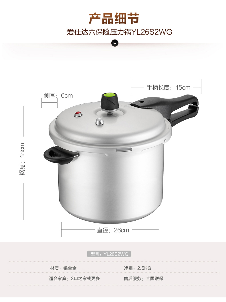 京东自营爆款推荐爱仕达 高压锅燃气 26cm压力锅明火 六保险/铝制防滑厚底 家用大容量YL26S2WG
