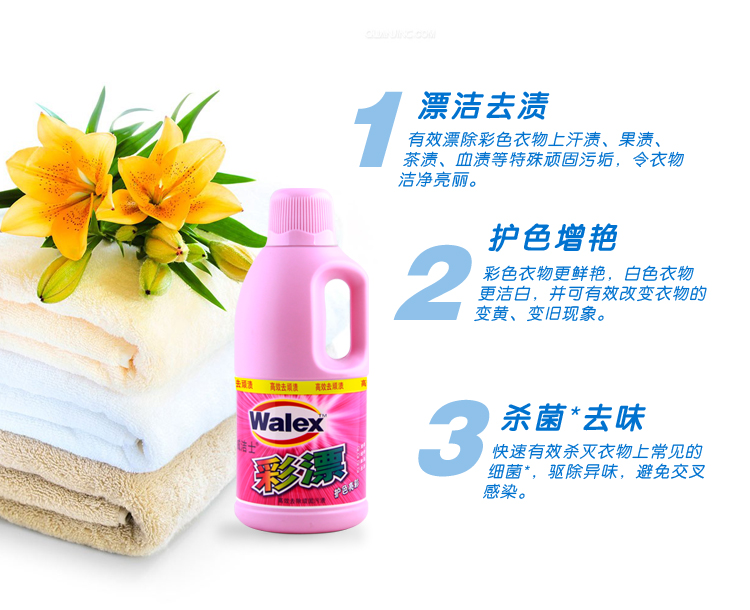 净含量:800g 产品功效: 1.漂洁去渍-有效漂除彩色衣物上汗渍、果渍、 茶渍、血渍等特殊顽固污垢,令衣物洁净亮丽。 2.护色增艳-使彩色衣物更鲜艳,白色衣物更洁 白,并可有效改变衣物的变黄、变旧现象。 3.杀菌*去味-快速有效杀灭衣物上常见的细菌* ,驱除异味,避免交叉感染。 适用范围 适用于各种颜色的衣物,性质温和,不伤衣料。 箱规:12支/箱