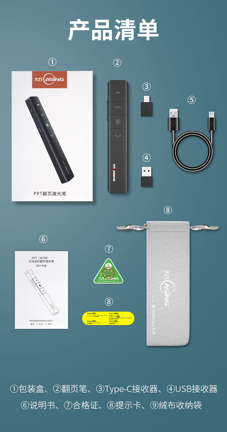 京东自营大行(ASiNG)360度遥控激光翻页笔 绿色透光 充电式投影笔 幻灯片遥控笔 PPT演示器 Type-c USB双接口黑色A61