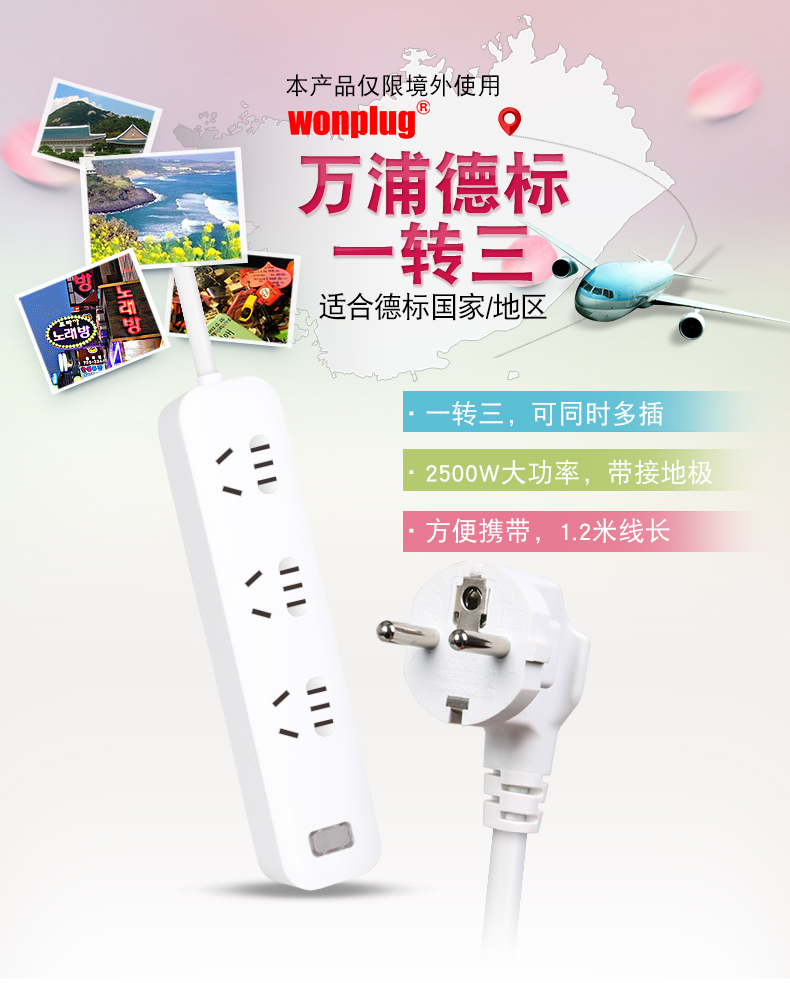 京东自营wonplug 德标排插带USB转换插头德国韩国巴厘岛法国俄罗斯越南土耳其欧洲欧标旅行插座电源转换器 不带USB口