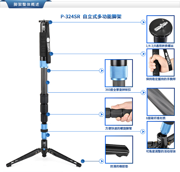 京东自营思锐(SIRUI)独脚架 P324SR 碳纤维不带云台佳能尼康单反相机脚架 配可拆卸三脚架底座 摄影摄像通用