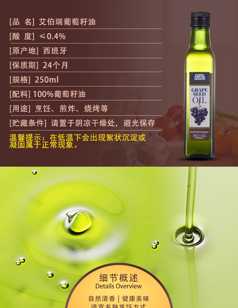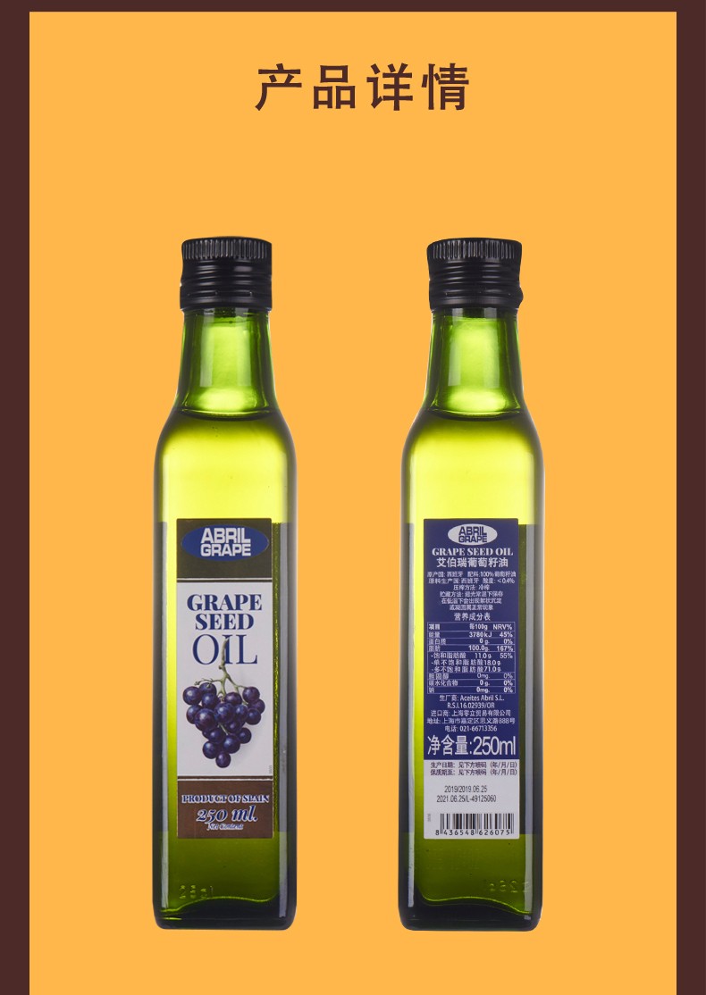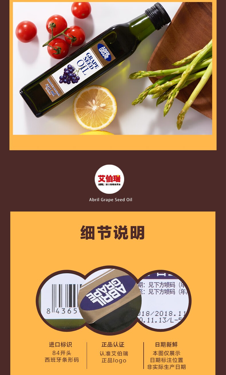 京东自营ABRIL艾伯瑞 葡萄籽油250ml 西班牙原装进口 食用油 烘焙 护肤