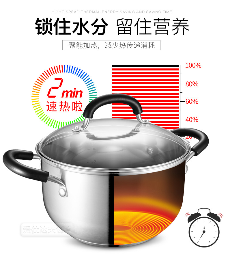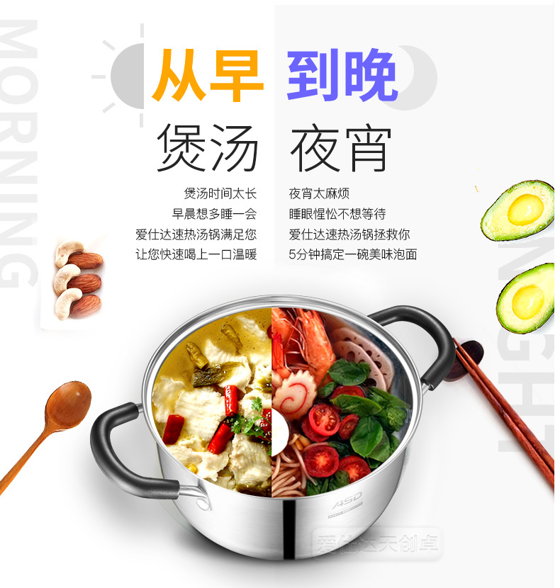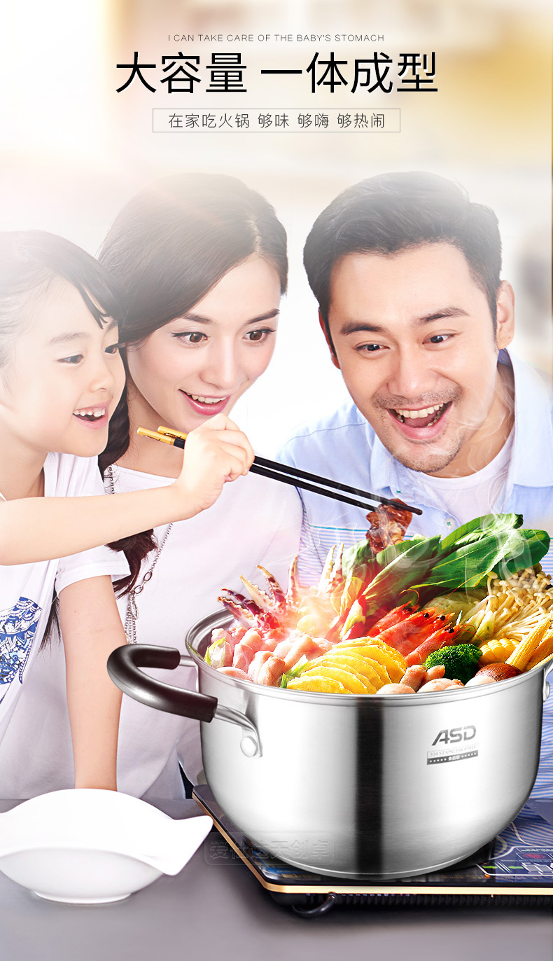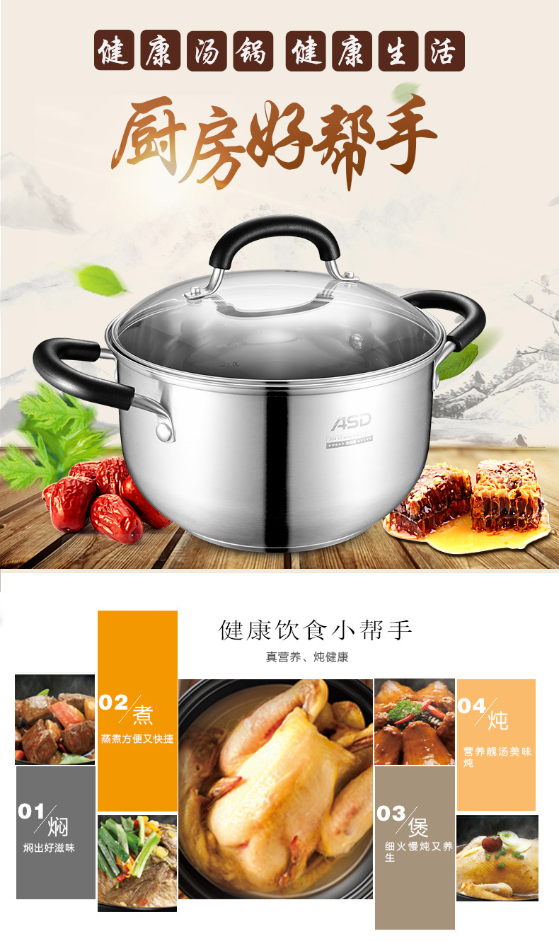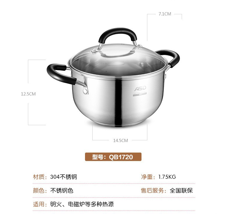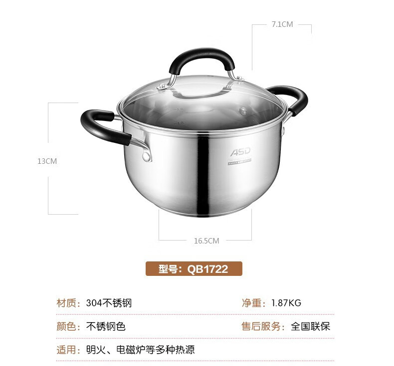 京东自营爱仕达(ASD)汤锅304不锈钢复底加厚煲汤锅煮面煮粥热奶锅宝宝辅食锅 电磁炉明火通用 QB1722 22cm