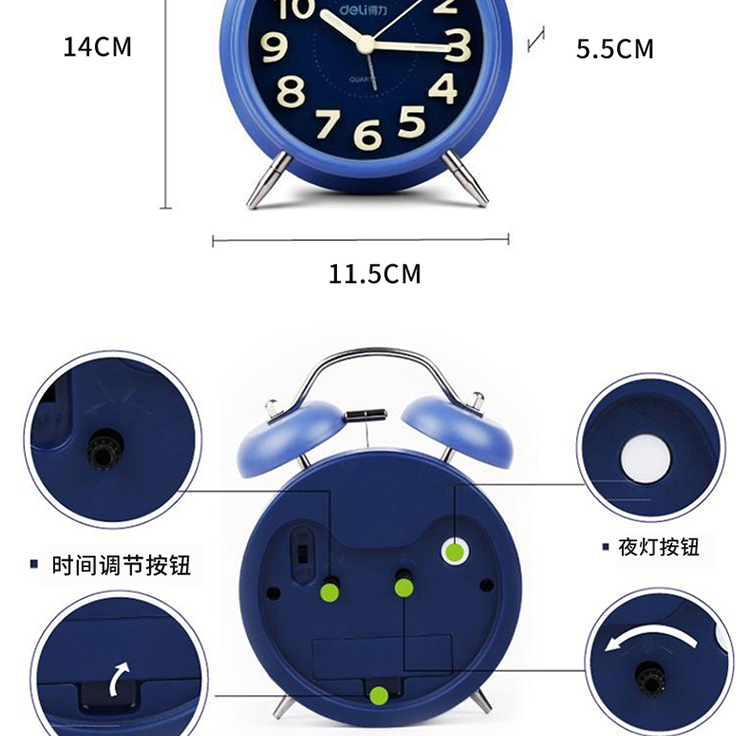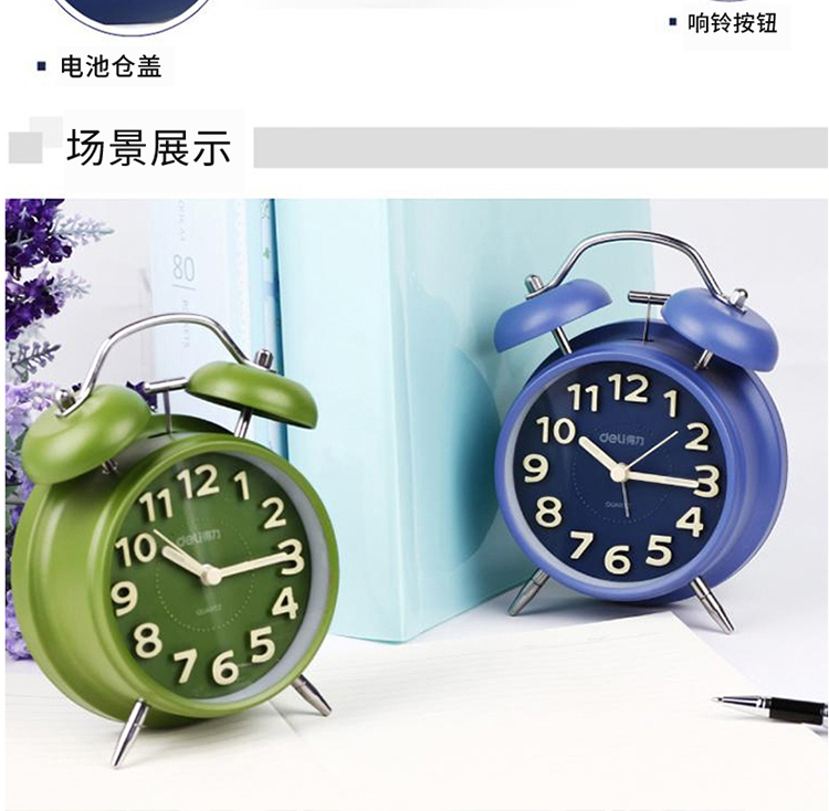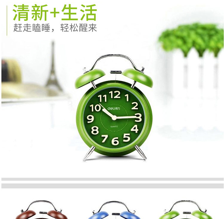 京东自营得力(deli) 4寸低噪音夜光彩色儿童闹钟 双铃懒人闹钟 颜色随机