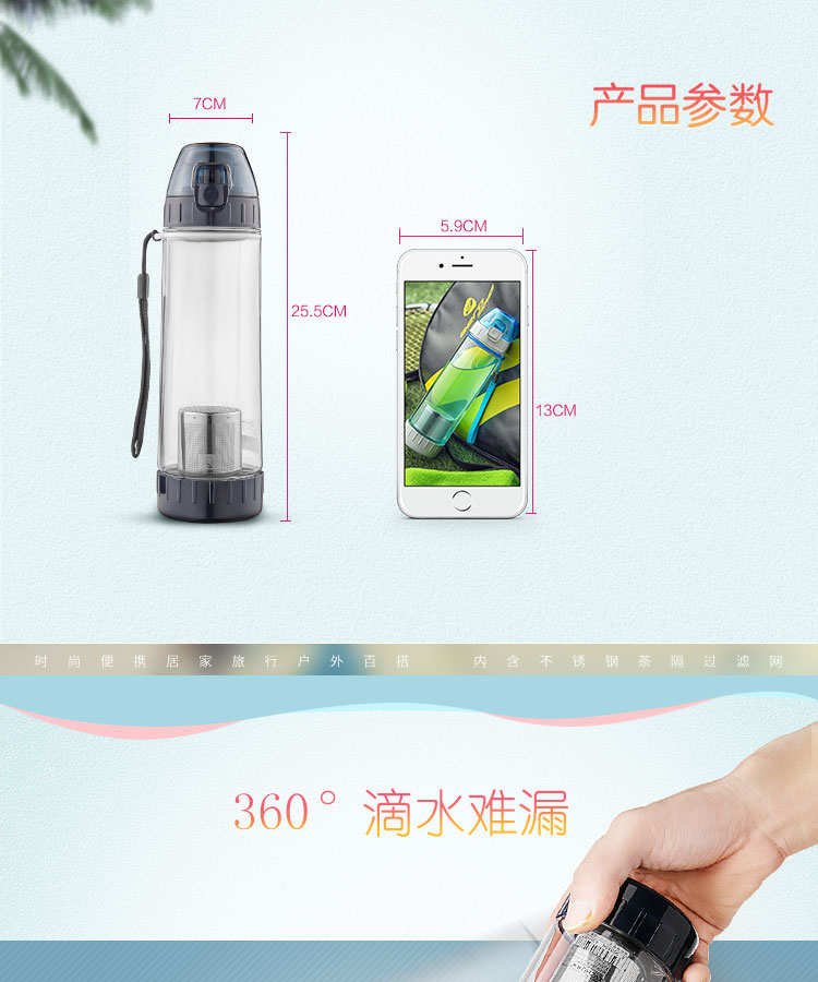 京东自营绿珠lvzhu 运动水杯 便携户外旅行随手塑料杯子 大容量男女学生防漏茶水分离水壶PC508深蓝色 600ml