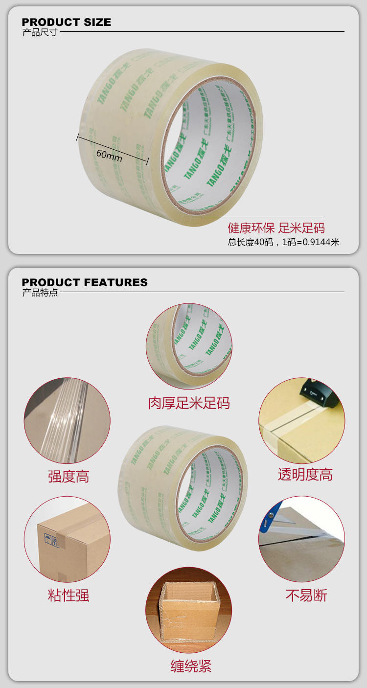 京东自营天章办公(TANGO)高品质高透明封箱胶带打包胶带60mm*40y(36.5米/卷)5卷装/高粘性宽胶带/探戈系列办公文具