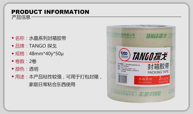 京东自营天章办公(TANGO)高品质高透明封箱胶带打包胶带48mm*40y(36.5米/卷) 2卷装 强力胶带 探戈系列办公文具