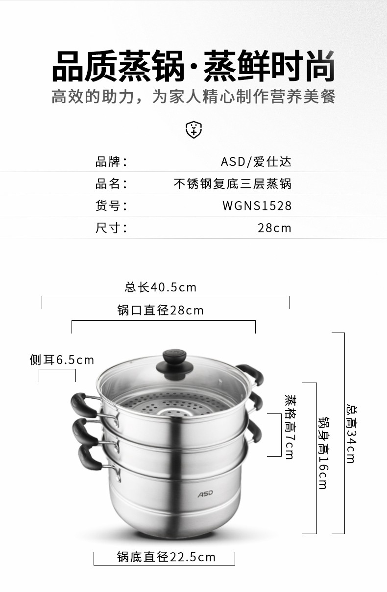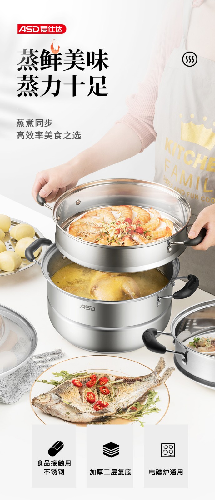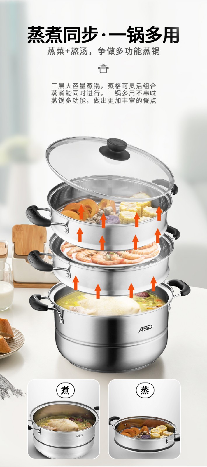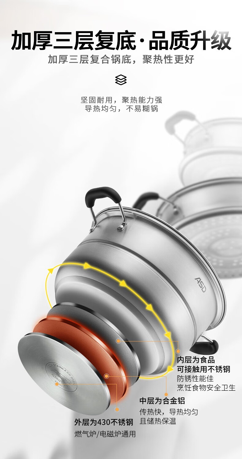 京东自营爱仕达(ASD)蒸锅 不锈钢三层复底炖锅煮锅大容量不串味多用 电磁炉燃气通用 28cm