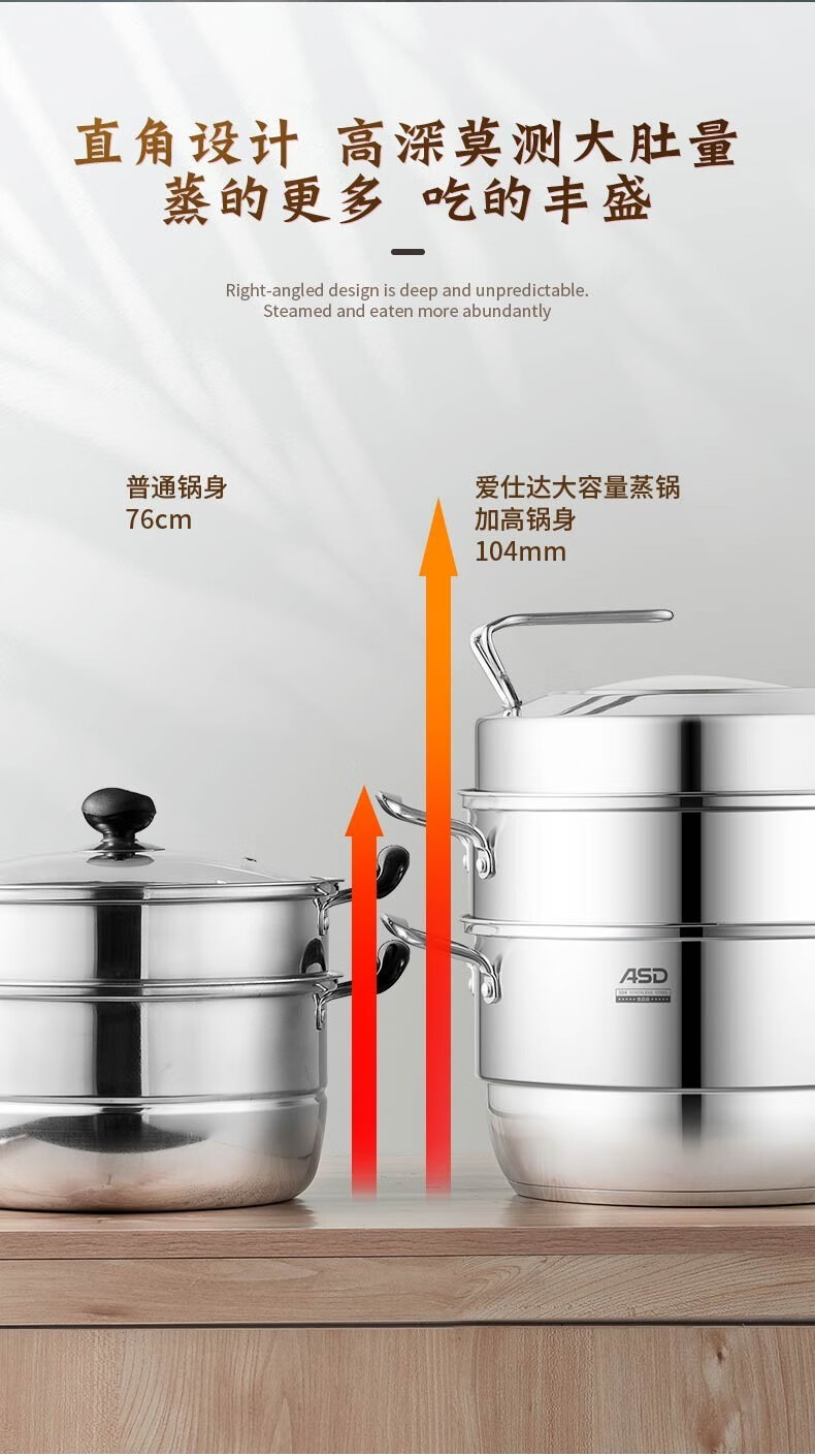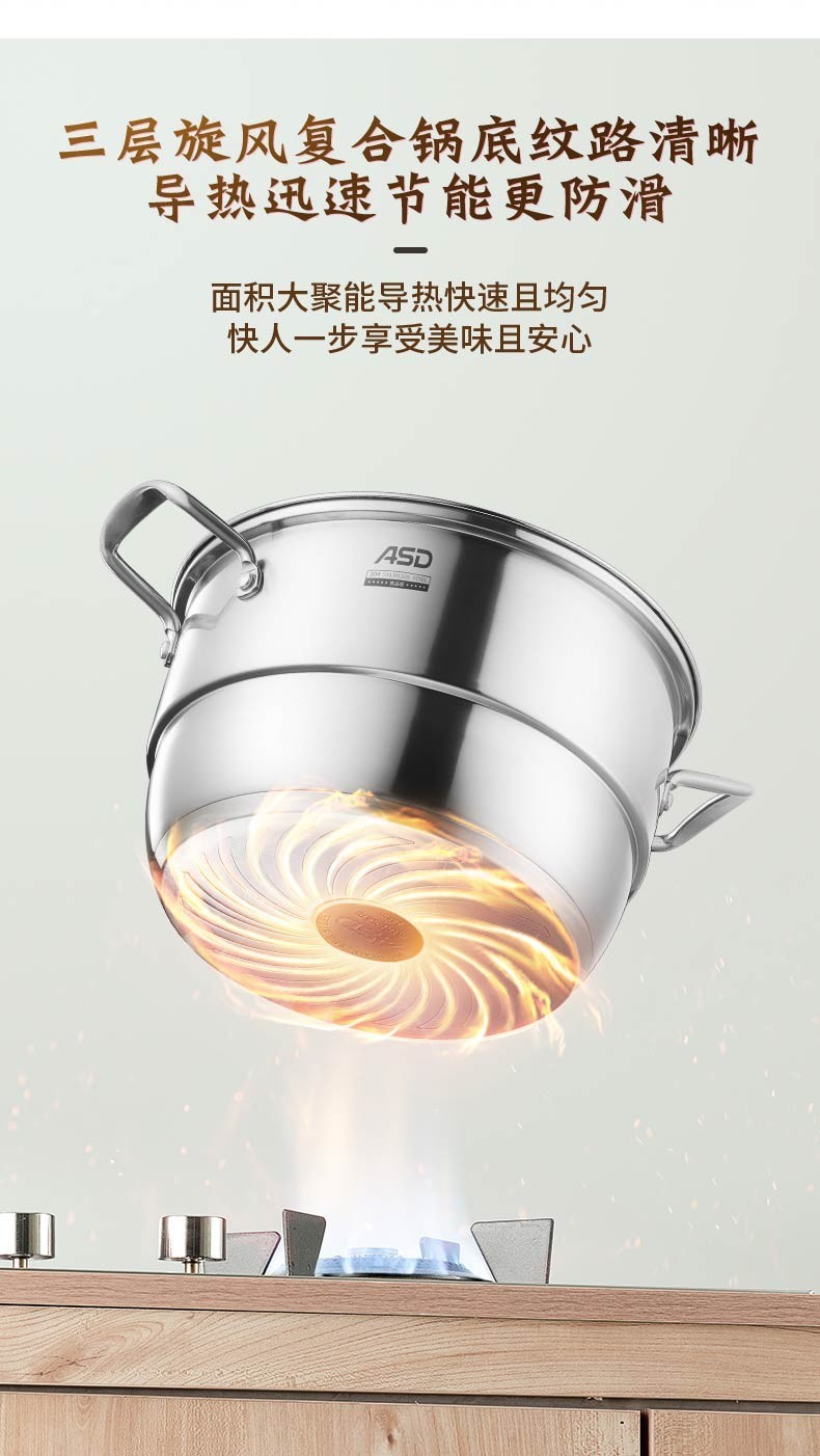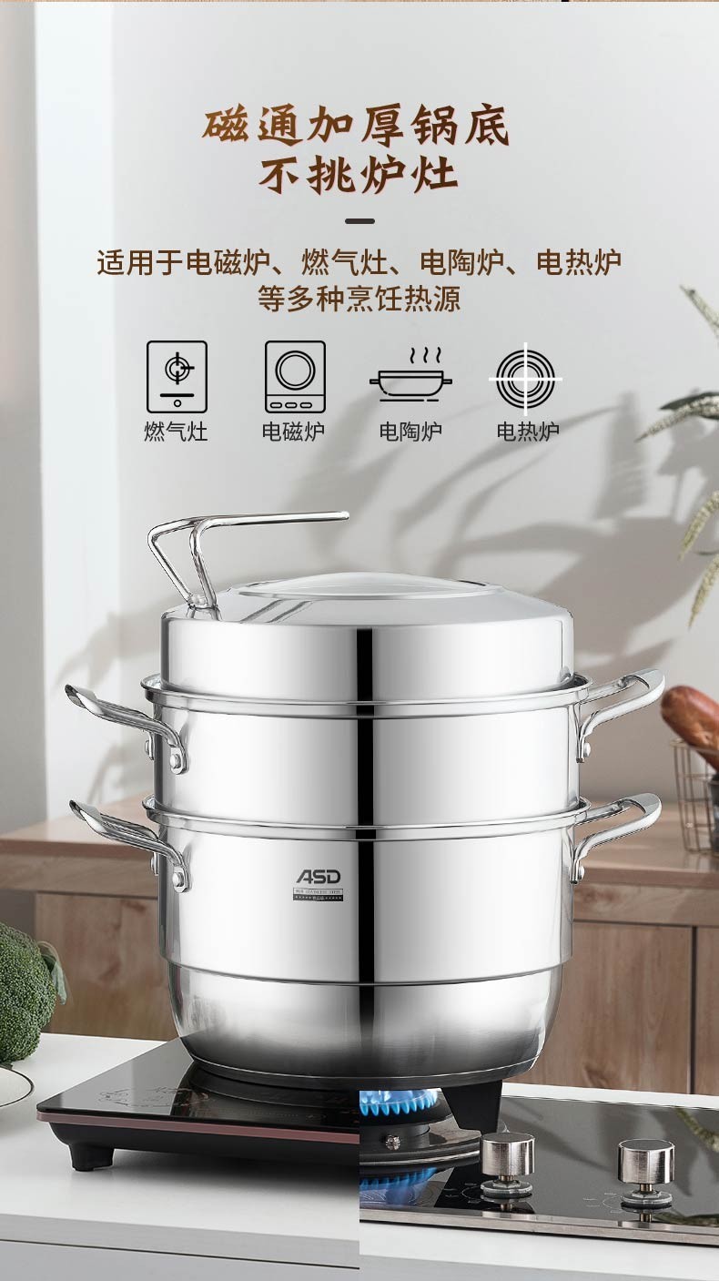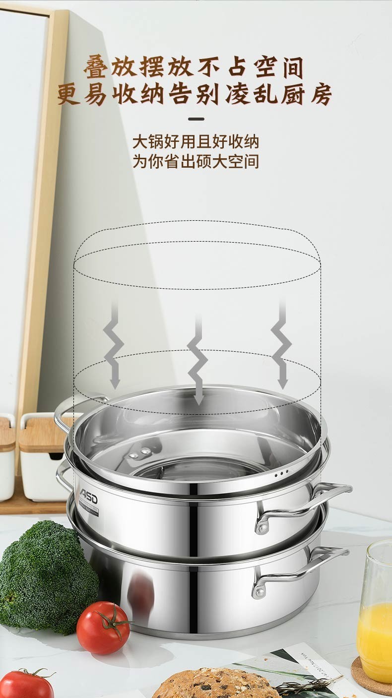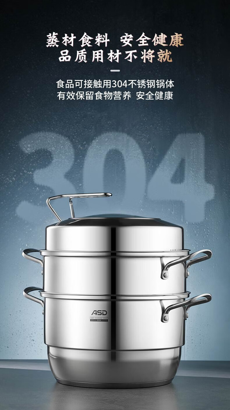 京东自营爱仕达(ASD)蒸锅304不锈钢不串味三层复底炖锅焖锅 电磁炉燃气通用 28cm