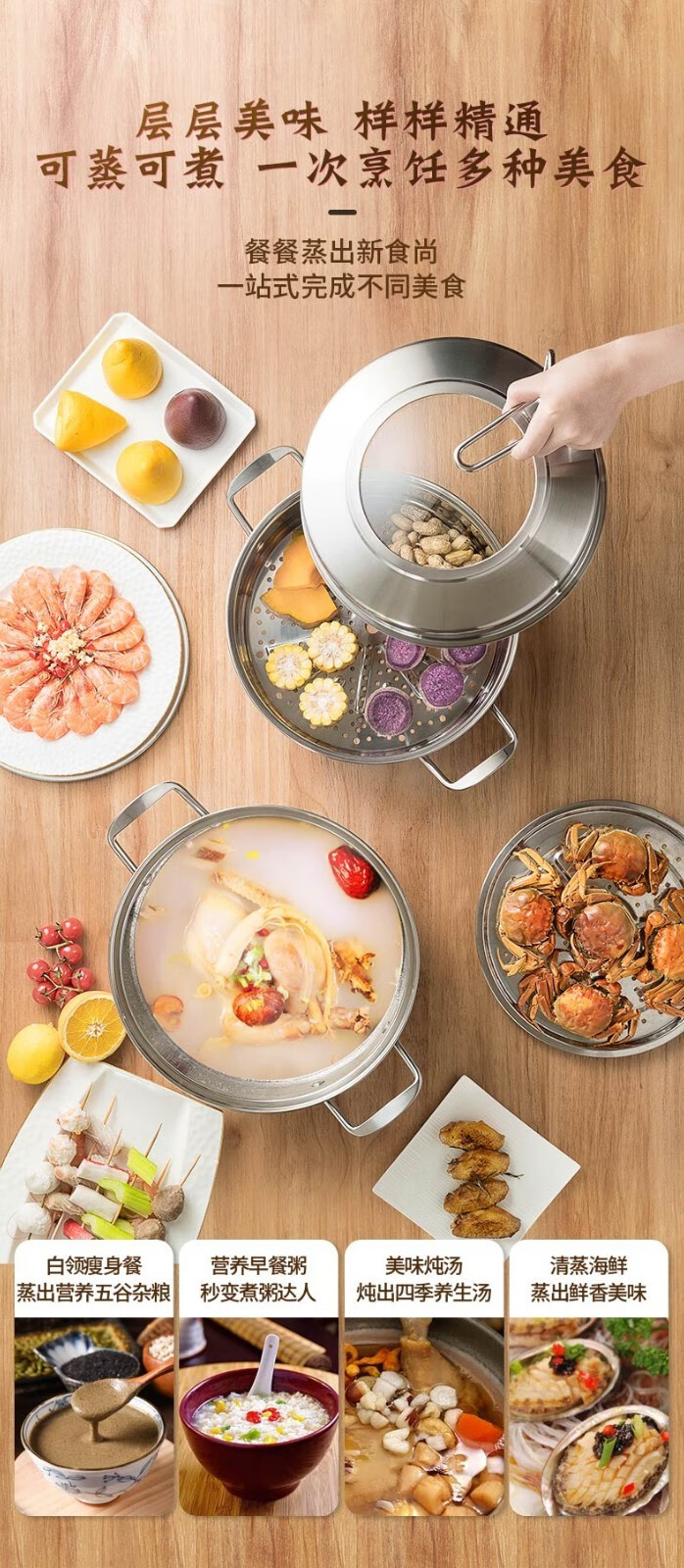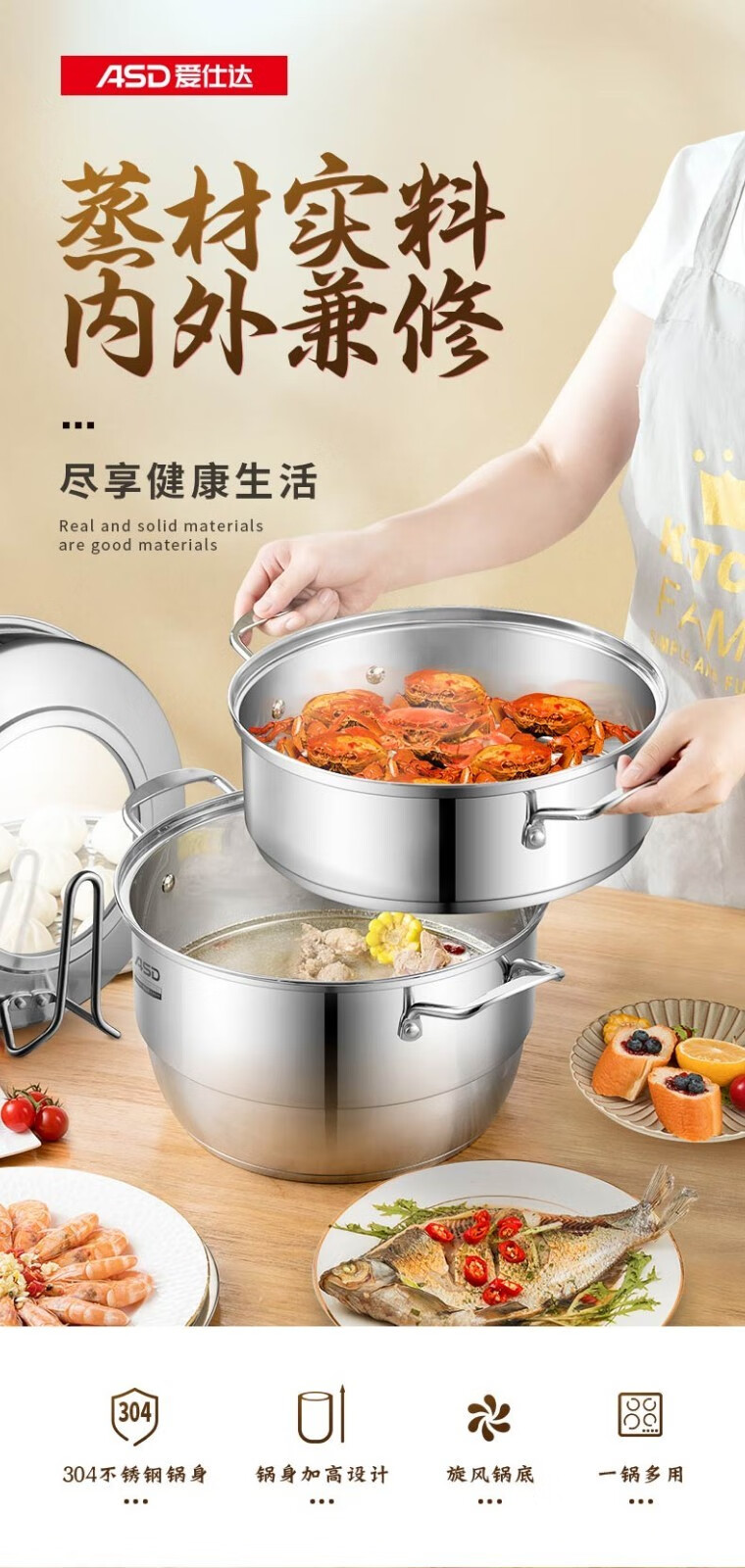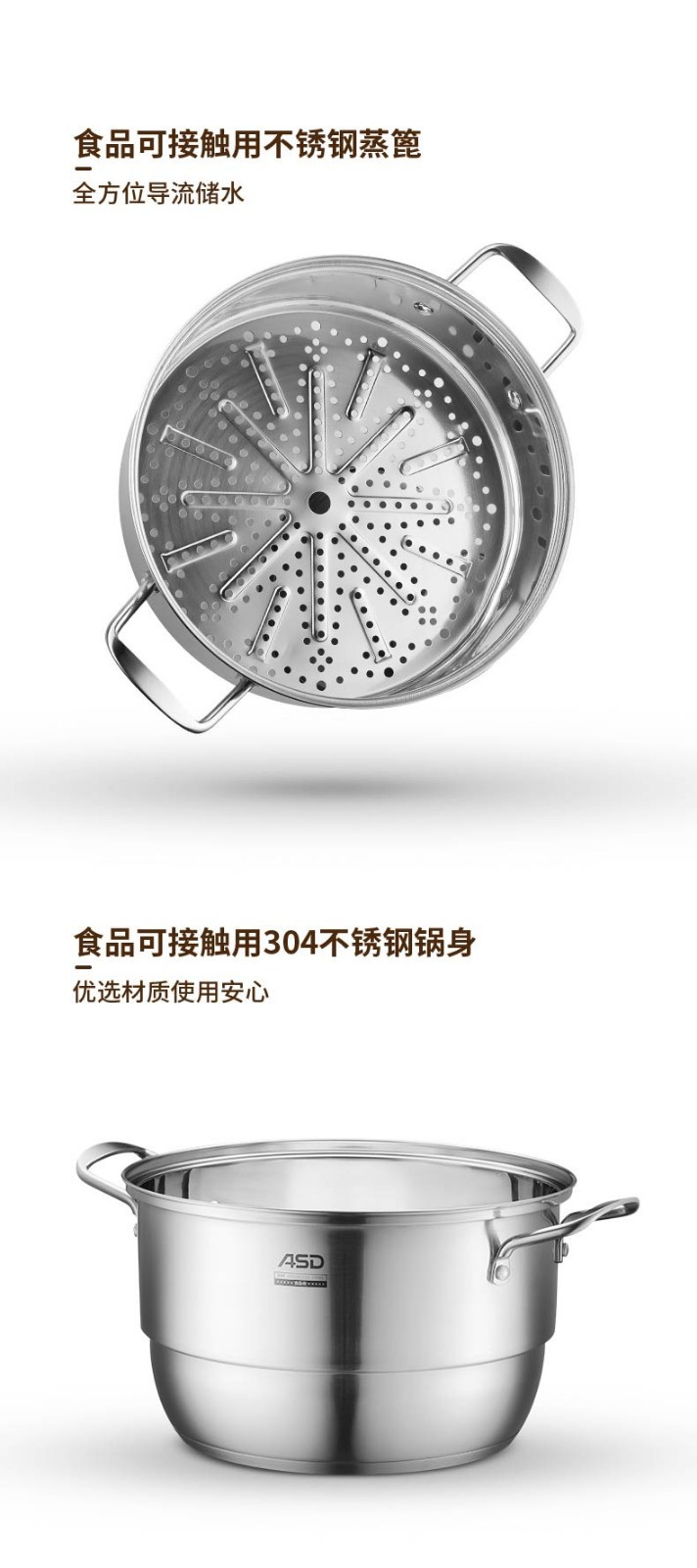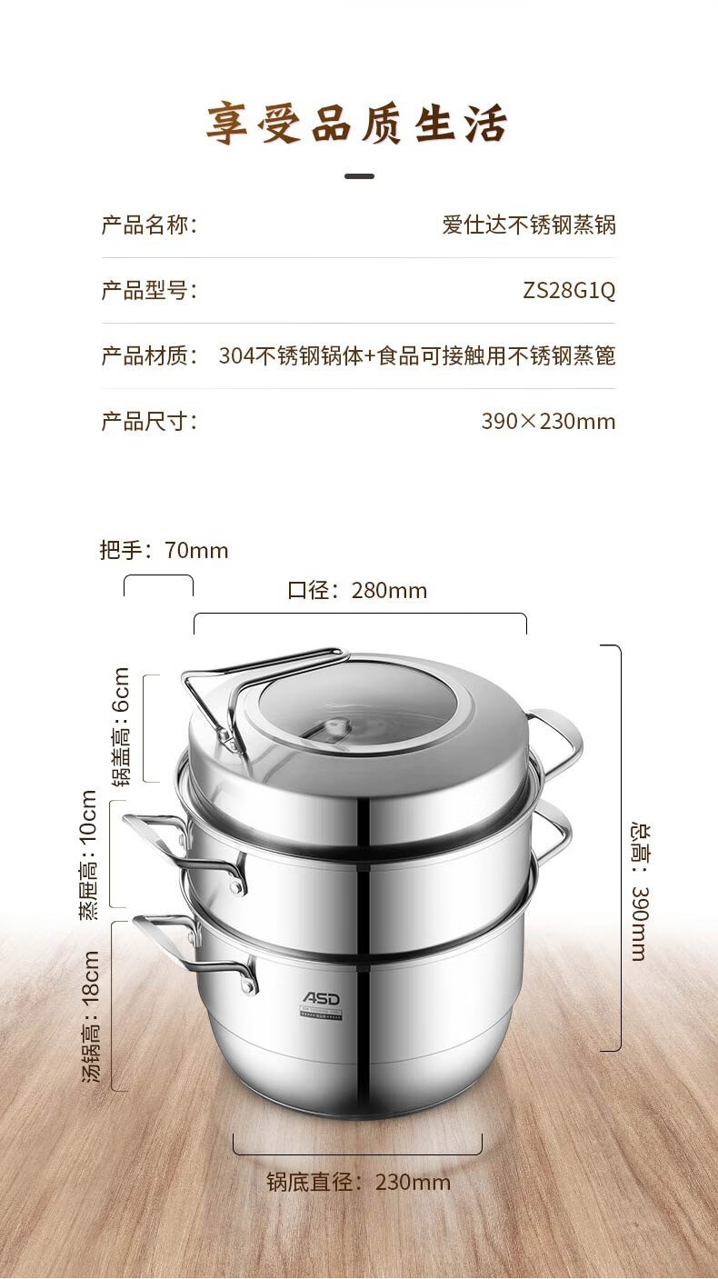 京东自营爱仕达(ASD)蒸锅304不锈钢不串味三层复底炖锅焖锅 电磁炉燃气通用 28cm