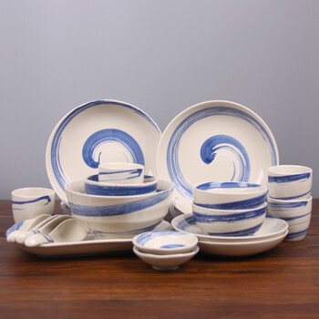 石田烧 日式釉下彩手绘陶瓷餐具套装 陶制碗碟盘勺礼盒装 复古线圈20头