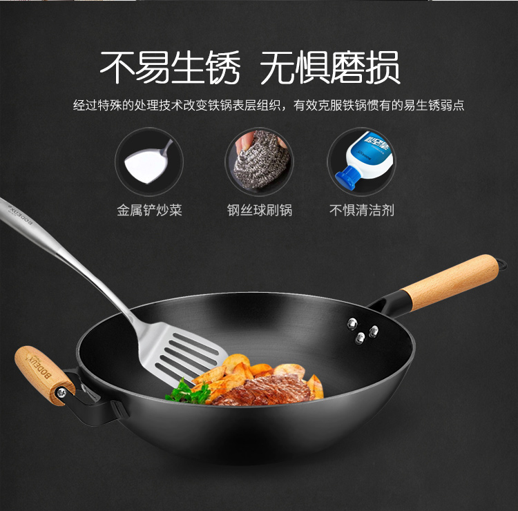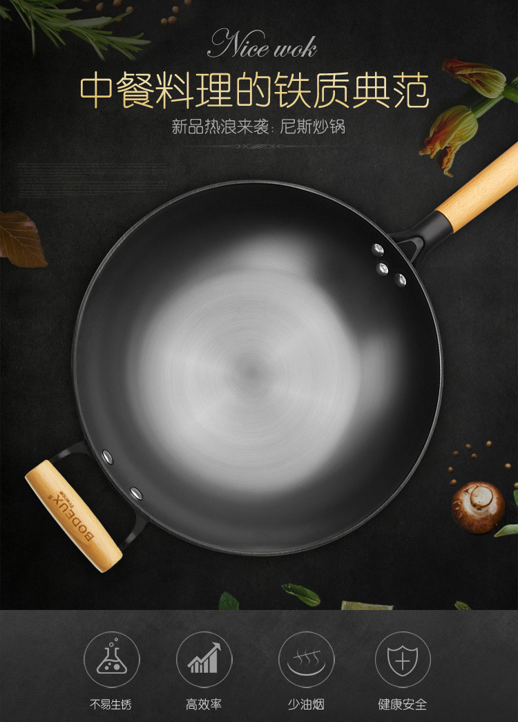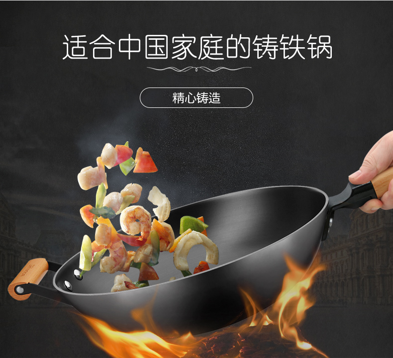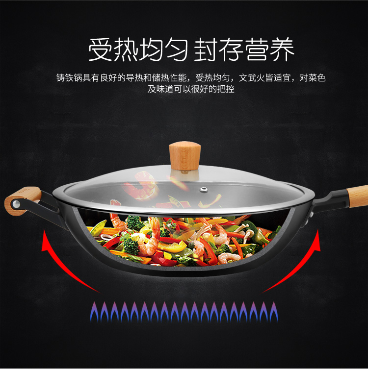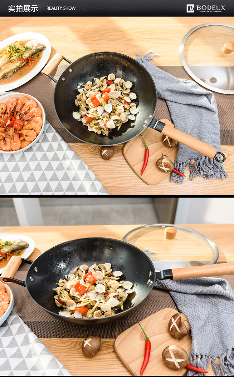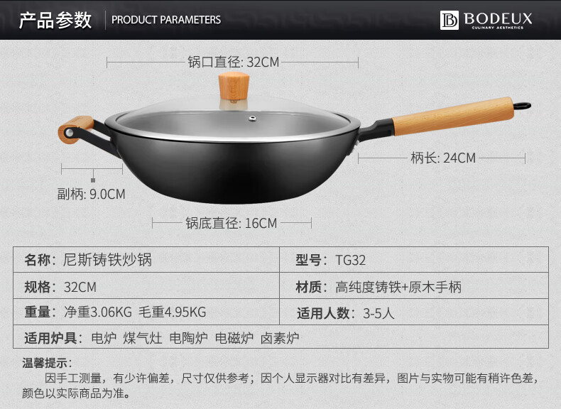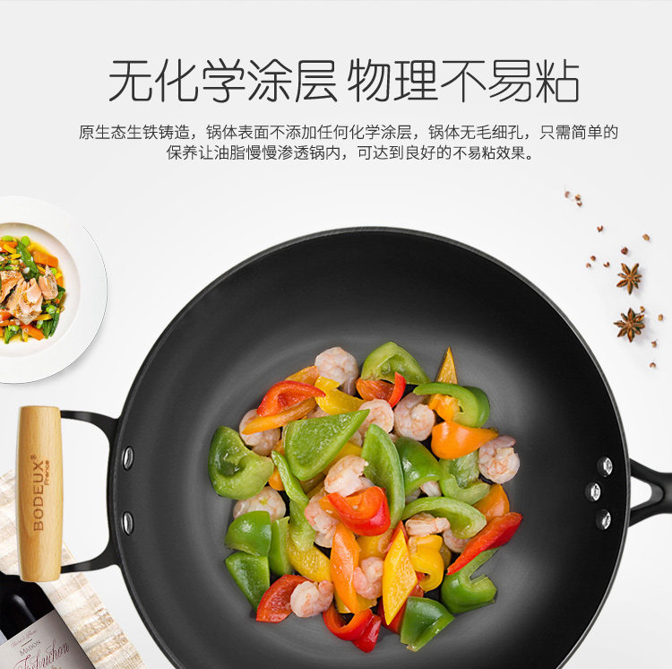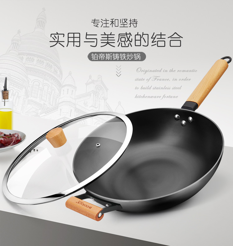 京东自营铂帝斯(BODEUX)尼斯铸铁炒锅 无涂层32cm带玻璃盖 不易生锈家用炒菜锅电 磁炉燃气通用