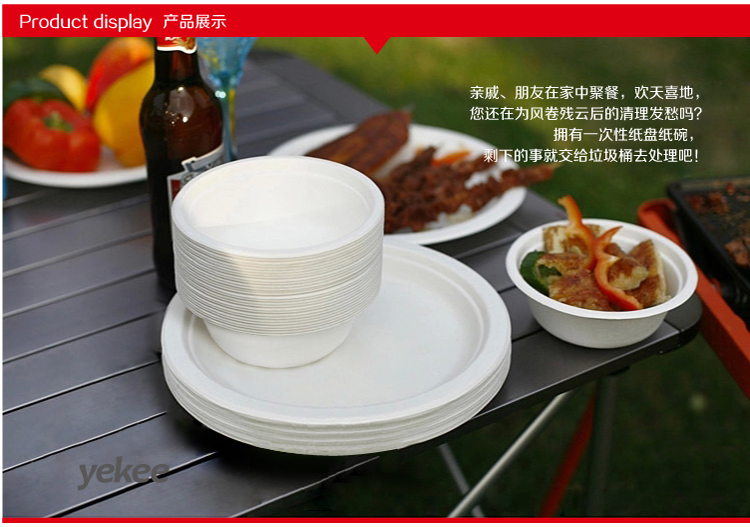 【商品名称】:宜洁一次性——快餐碟 【对应货号】:Y-9721 【商品尺寸】:¢205*18H/10只/袋 【主要材质】:天然甘蔗纸浆 【产品特点】:天然纸质 安全卫生 自然降解 绿色环保 厚实坚挺 耐热防油 【适用范围】:家庭欢聚 户外休闲 朋友聚会
