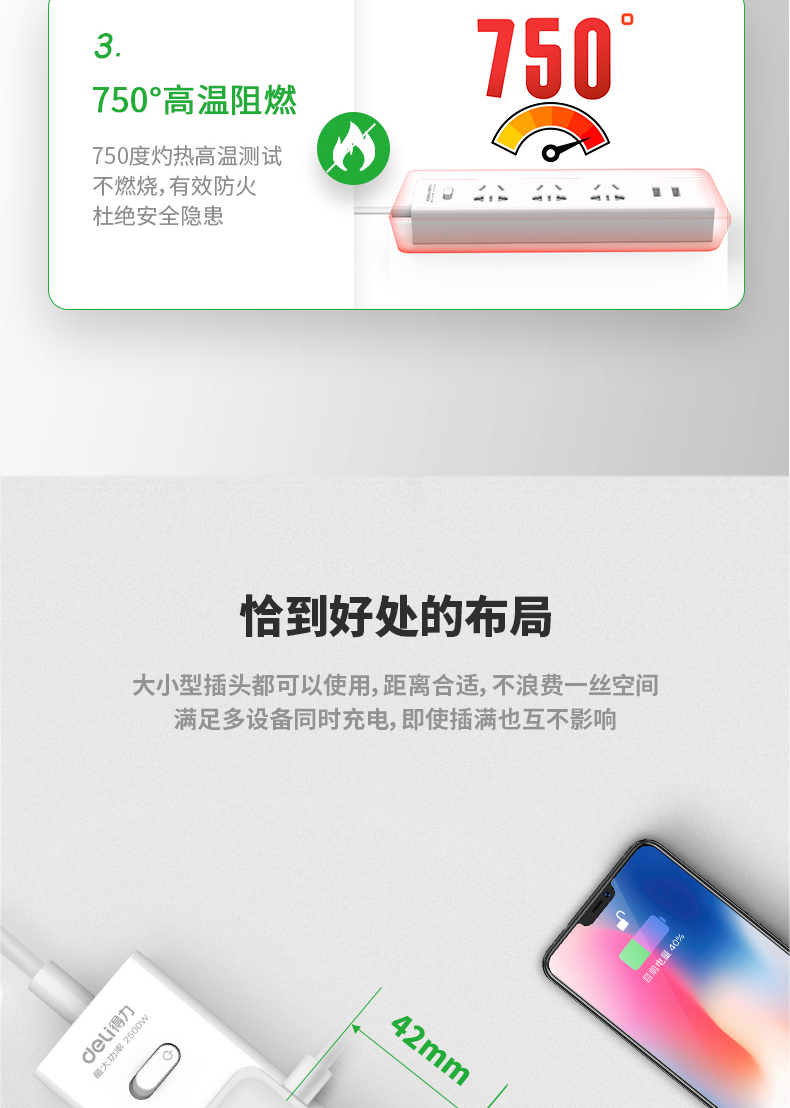 京东自营得力(deli)USB智能插座 插排/插线板/接线板/排插/拖线板 2USB接口+3孔 总控1.8米 儿童保护门 18221