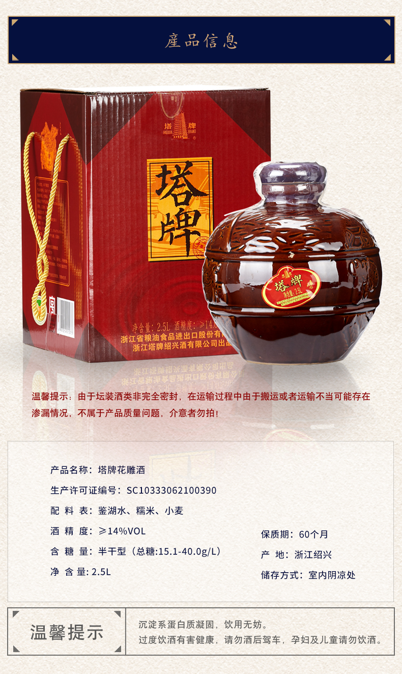 京东自营塔牌 绍兴黄酒 五年陈2.5L花雕酒坛装半干型 手工黄酒