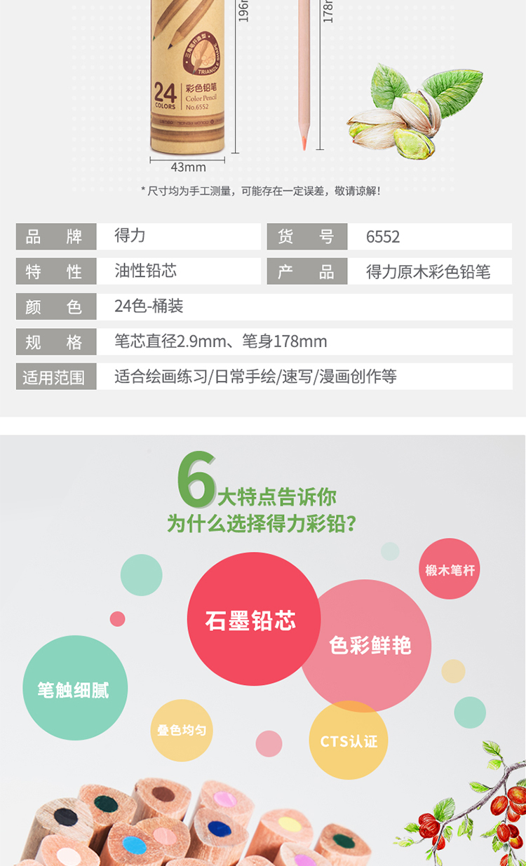 京东自营得力(deli)6552 原木油性24色彩铅彩色铅笔 三角杆 桶装
