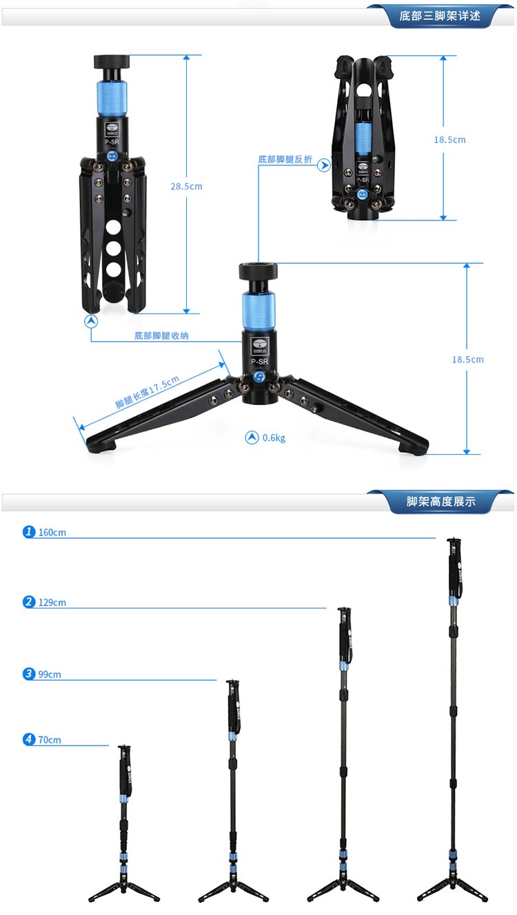 京东自营思锐(SIRUI)独脚架 P-224SR 碳材独脚架 配可拆卸三脚架底座 单反套机 摄影摄像通用