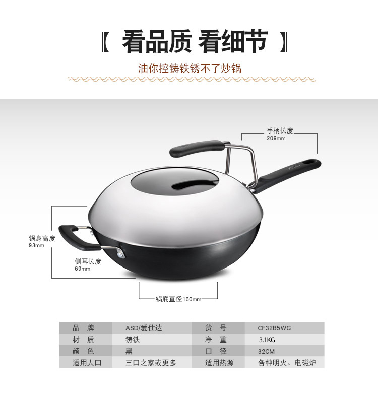 京东自营爱仕达 炒锅 32CM油你控铸铁锈不了炒锅CF32B5WG 炒菜锅煎锅