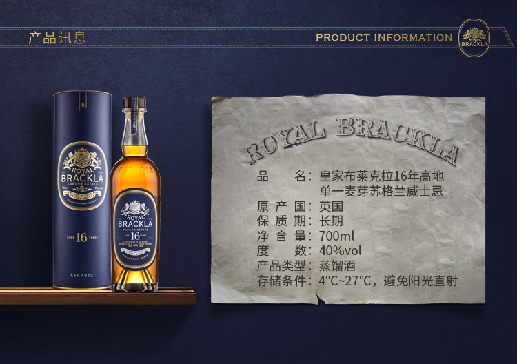 京东自营皇家布莱克拉(ROYAL BRACKLA)洋酒 威士忌 16年单一麦芽威士忌酒 700ml