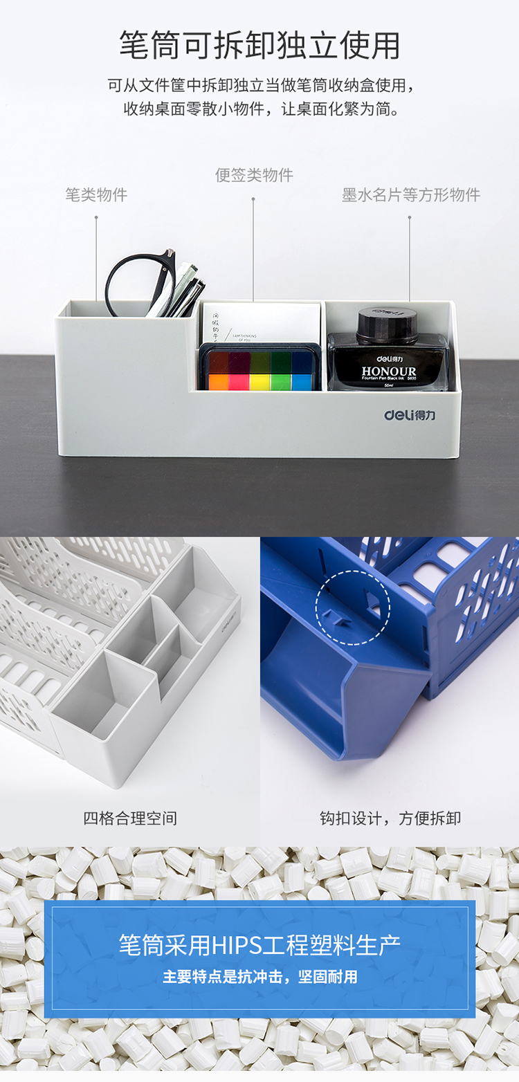 京东自营得力(deli)三联带笔筒收纳桌面文件框 多功能镂空文件栏/文件框/资料筐 蓝色
