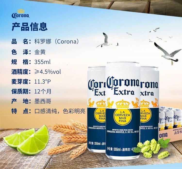 京东自营科罗娜啤酒 墨西哥进口啤酒 355ml*10听装 配专用科罗娜啤酒杯2个