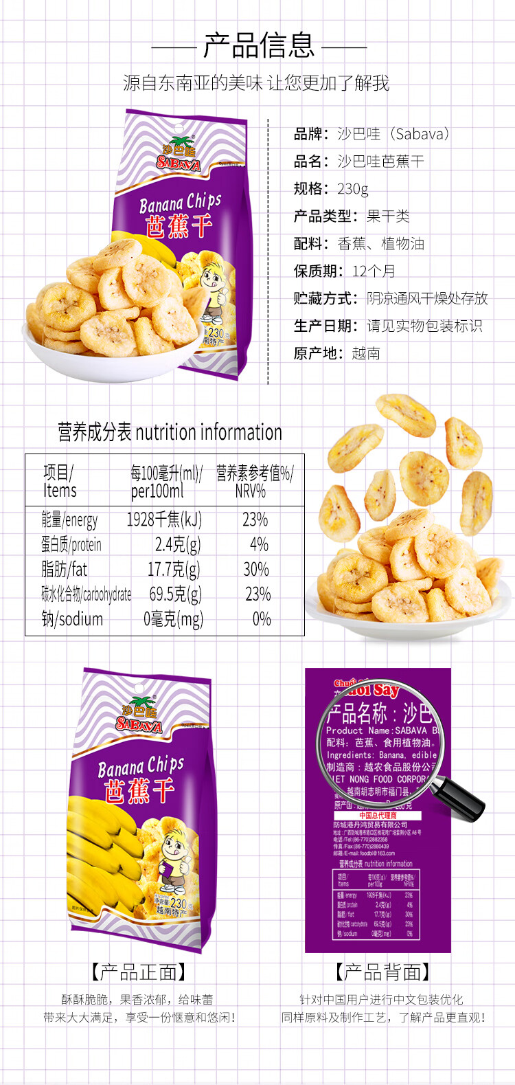 京东自营越南进口 沙巴哇(Sabava) 香甜芭蕉香蕉干 230g/袋(原味)即食水果干 休闲零食小吃