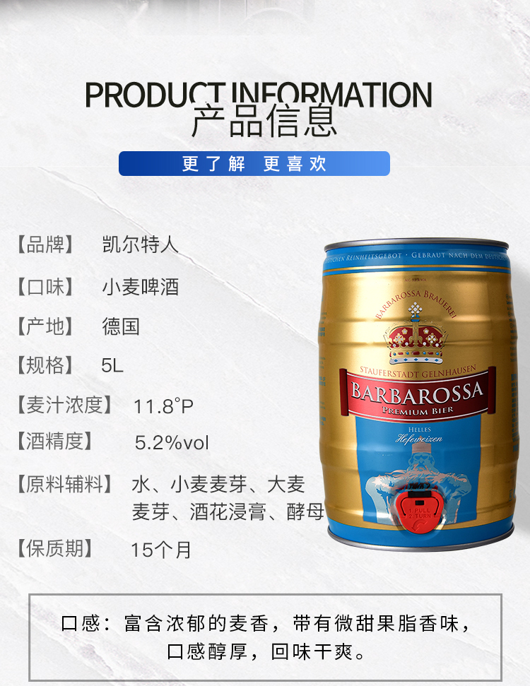 京东自营凯尔特人德国进口小麦啤酒5L桶装