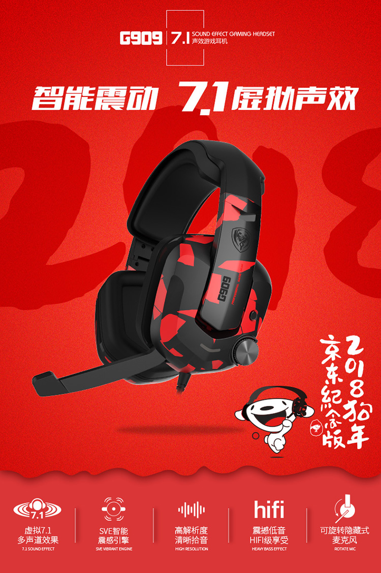 京东自营硕美科(SOMIC)G909 游戏耳机 听声辩位吃鸡耳机头戴式 电脑耳机耳麦7.1声效震动京东定制版吃鸡耳机