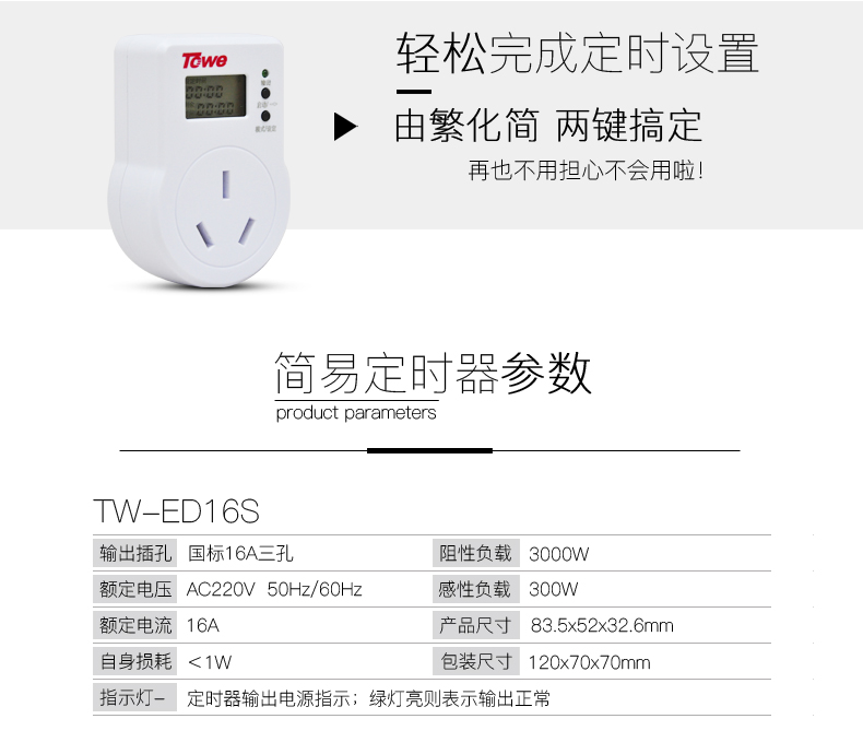 京东自营TOWE 同为16a大功率智能电子简易定时器插座倒计时自动断电