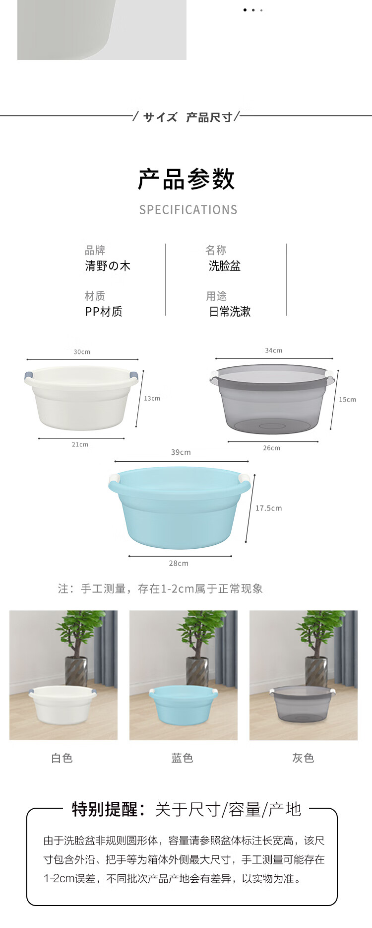 京东自营清野の木 塑料洗脸盆大号象牙白加厚耐摔洗衣洗菜盆