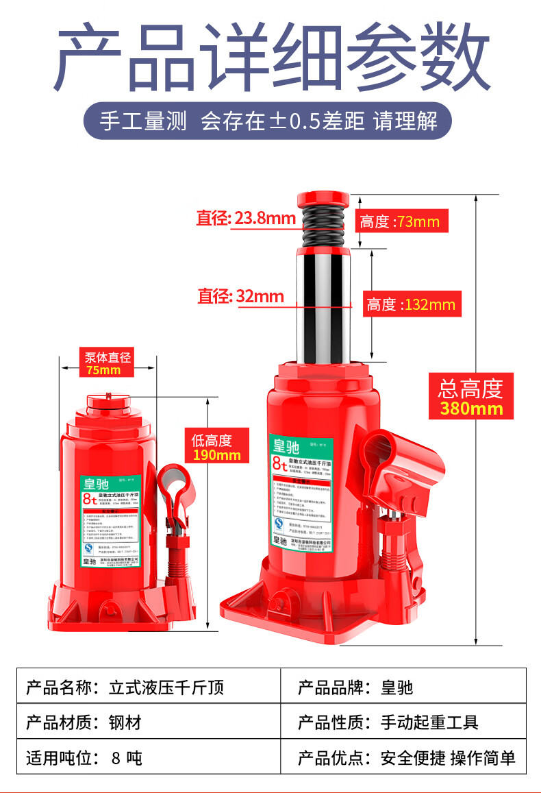 京东自营皇驰 汽车千斤顶轿车液压立式支架SL-80车用油压手摇8吨卧式车载换胎工具定制