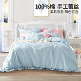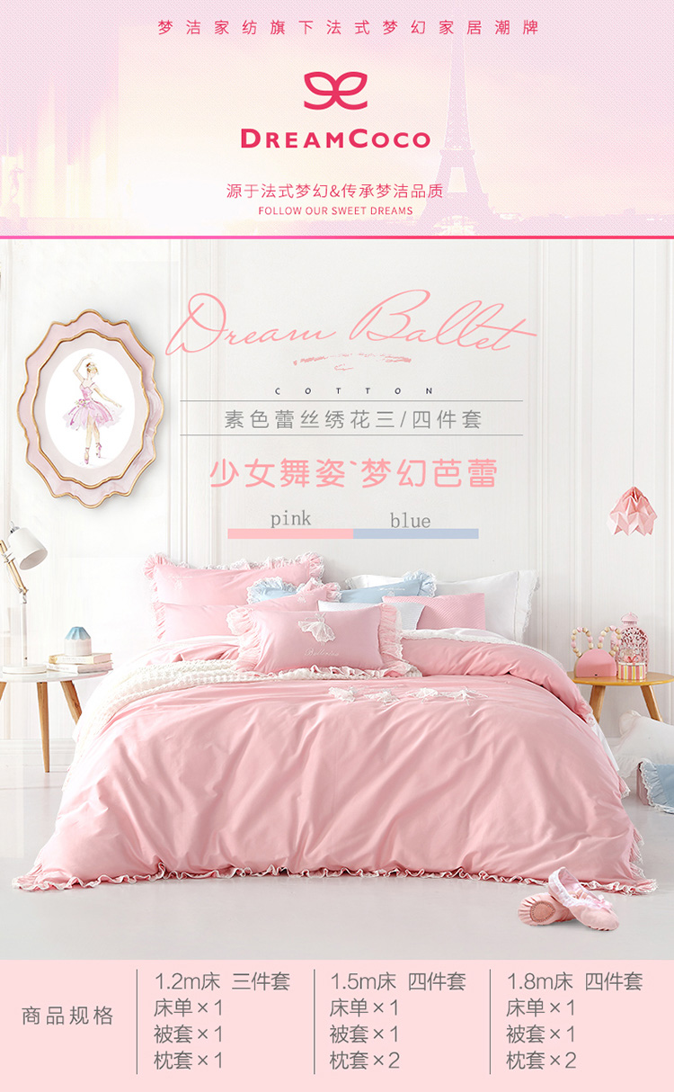 京东自营梦洁家纺 DreamCoCo 床上用品 纯棉素色蕾丝绣花四件套 全棉床单被套 梦幻芭蕾 蓝 1.8m床 220*240cm