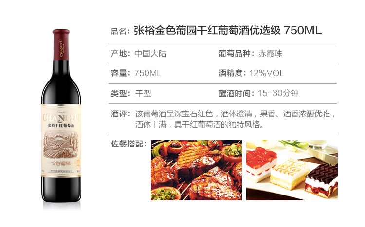 京东自营张裕 金色葡园 优选级 干红葡萄酒 750ml 单瓶装