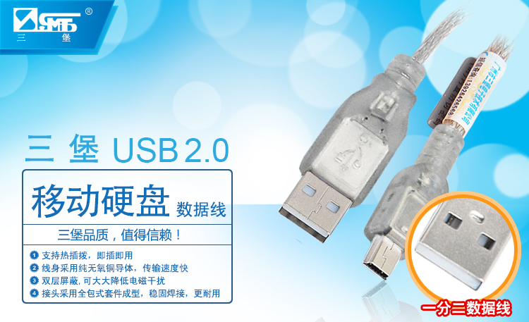 京东自营三堡(SANBAO) USB-2005 移动硬盘数据线 T型口双USB+MINI USB2.0数据线 一分二数据线